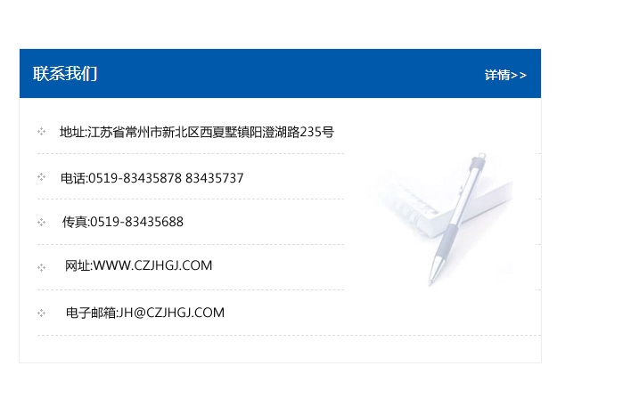 地址:常州市新北區友邦商務大廈1幢16、17層  電話:0519-85101652  傳真:0519-85112595  郵編:213022  網址:www_cz-jiayue_cn.guanyong56.com  郵箱:xiajifengaa@163.com